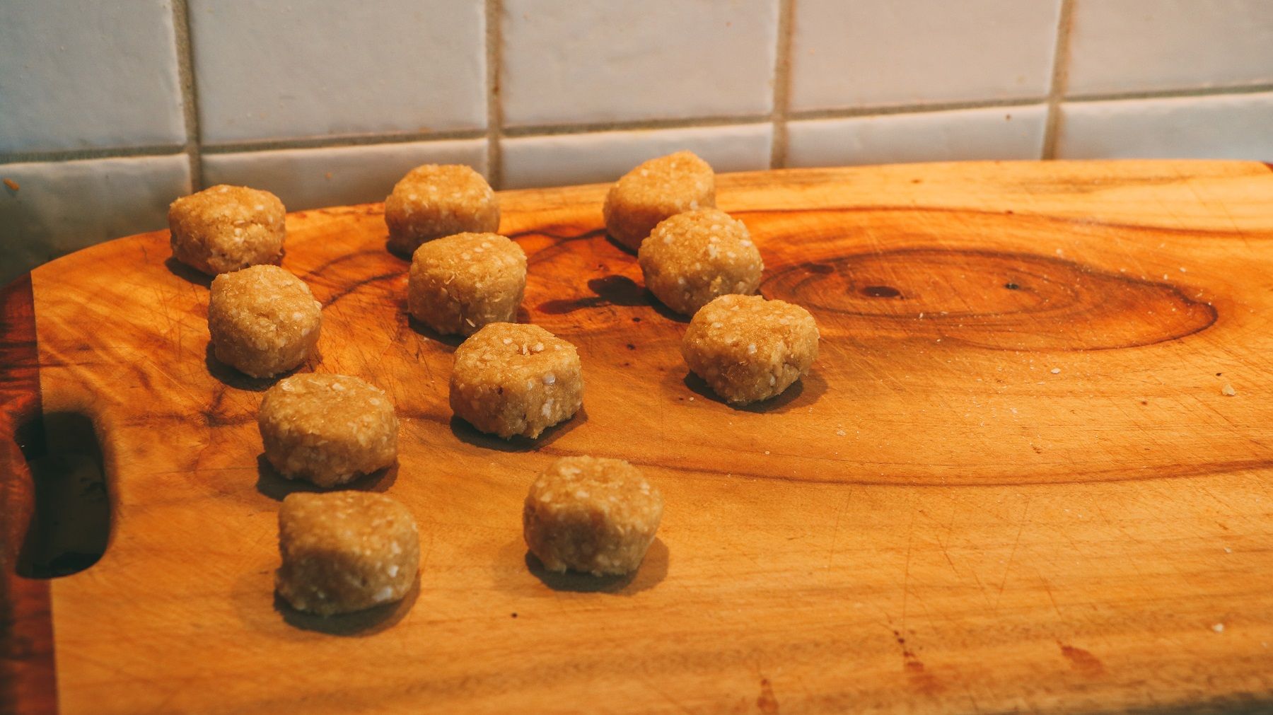- Line two baking trays with baking paper. With wet hands, take 1 tbsp of mixture for small cookies (pictured) or 2 tbsp for large, and squeeze tightly in the palm of your hand to form a rough ball. Round the edges and gently flatten the top. Place on a baking tray keeping in mind they will double in size (I fit 11 small or 8 large to a tray) and repeat with the rest of the mixture.