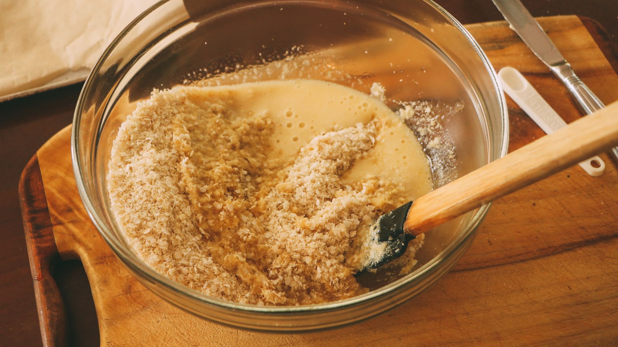 - Mix the wet ingredients into the dry, to form a wet, crumbly mixture. It should look a little on the dry side, but hold together when squeezed.