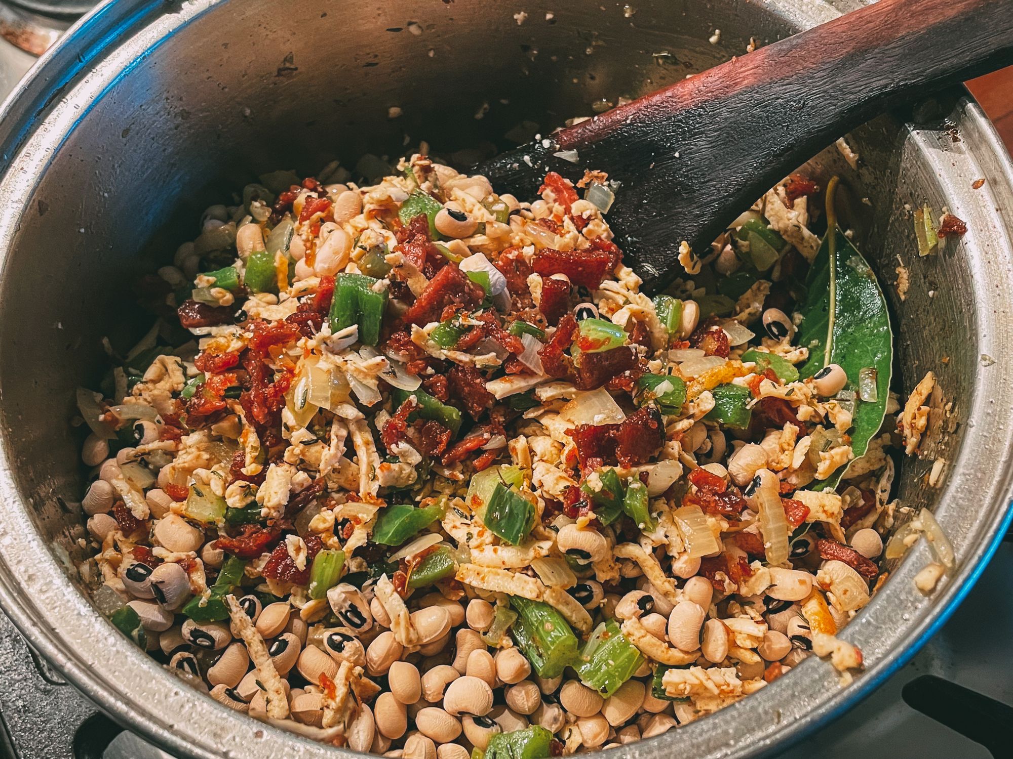 - Add the dried black eyed peas and hot water to the pot. Bring to the boil, then reduce the heat to a simmer & cook for approximately 1 hour, until the black eyed peas are tender and soft. Add more hot water during this time as needed, to ensure the beans are fully submerged. Add the bacon and tofu back to the pot for the last 10 minutes or so, if you do this any earlier they might start to disintegrate.