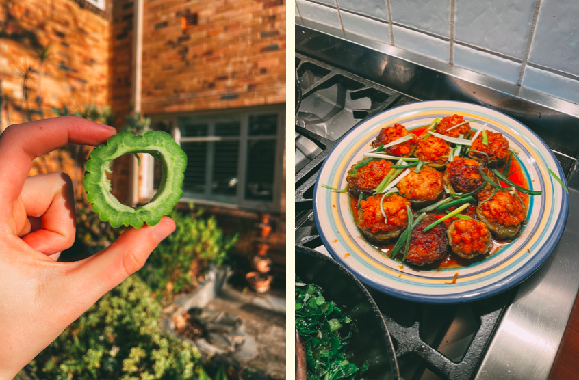 I made another recipe from Plantasia: a vegetarian cookbook through Asia, the cookbook I'm the Australian stockist for. I've been so intrigued by the tofu caramel bitter-gourd recipe - because bitter-gourd looks like SUCH an interesting vegetable. It's stuffed with a sweet tofu lemongrass soy filling which was so scrummy. I didn't fall in love with bitter-gourd, it's intensely bitter - but I'm very glad I had a holding hand to walk me through giving it a go and you'll see me applying the same tofu stuffed-veg logic to other vegetables for sure!