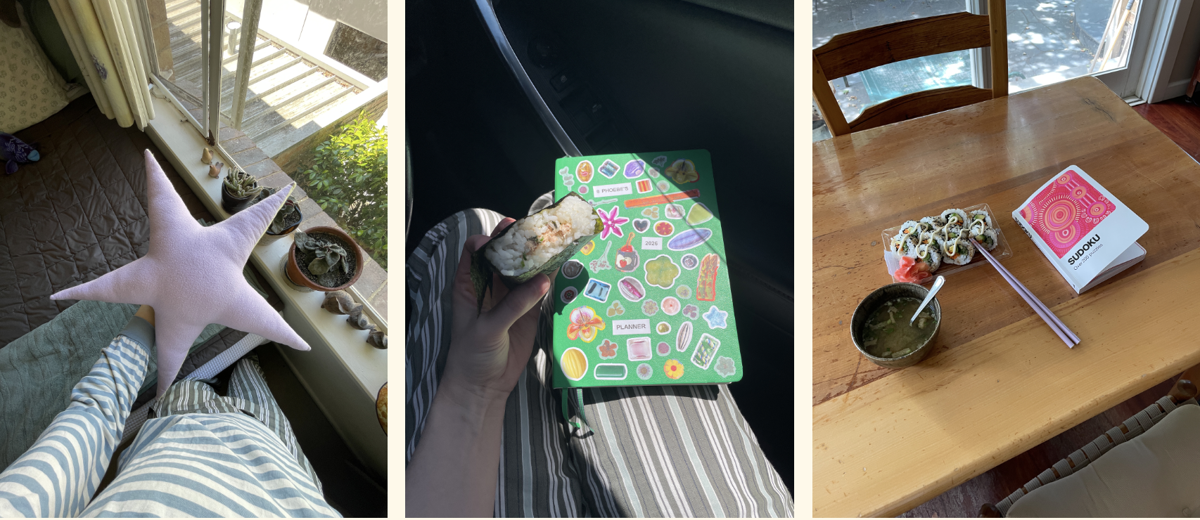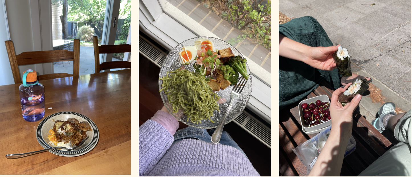 L–R: a bowl of vegemite miso noodle rice paper dumplings (I Want Dopamine for Dinner recipe) for comfort, green miso ginger noodles (I Want Dopamine for Dinner recipe) with seasoned tofu and an egg and homemade tuna onigiri shared with a friend – which was 10/10!