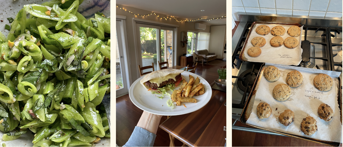 L–R: Minimalist Baker's sugar snap salad (really yum and lasts well), vegan burgers with homemade wedges and lots of protein chocolate chip cookie trials.