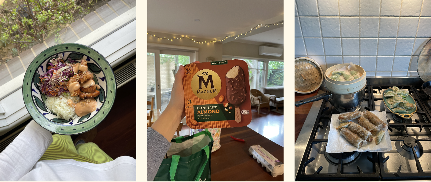 L–R: bang bang salmon bowl with miso slaw and buttered jasmine rice, almond plant-based magnums (because they're gluten-free as well now?) and homemade dumplings with rice paper spring rolls (I Want Dopamine for Dinner recipe).