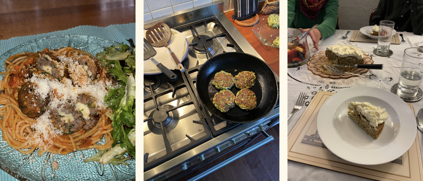 L–R: vegan cheese stuffed impossible mince meatballs with spaghetti and salad, zucchini fritters and a white chocolate and pistachio cake for Christmas eve.