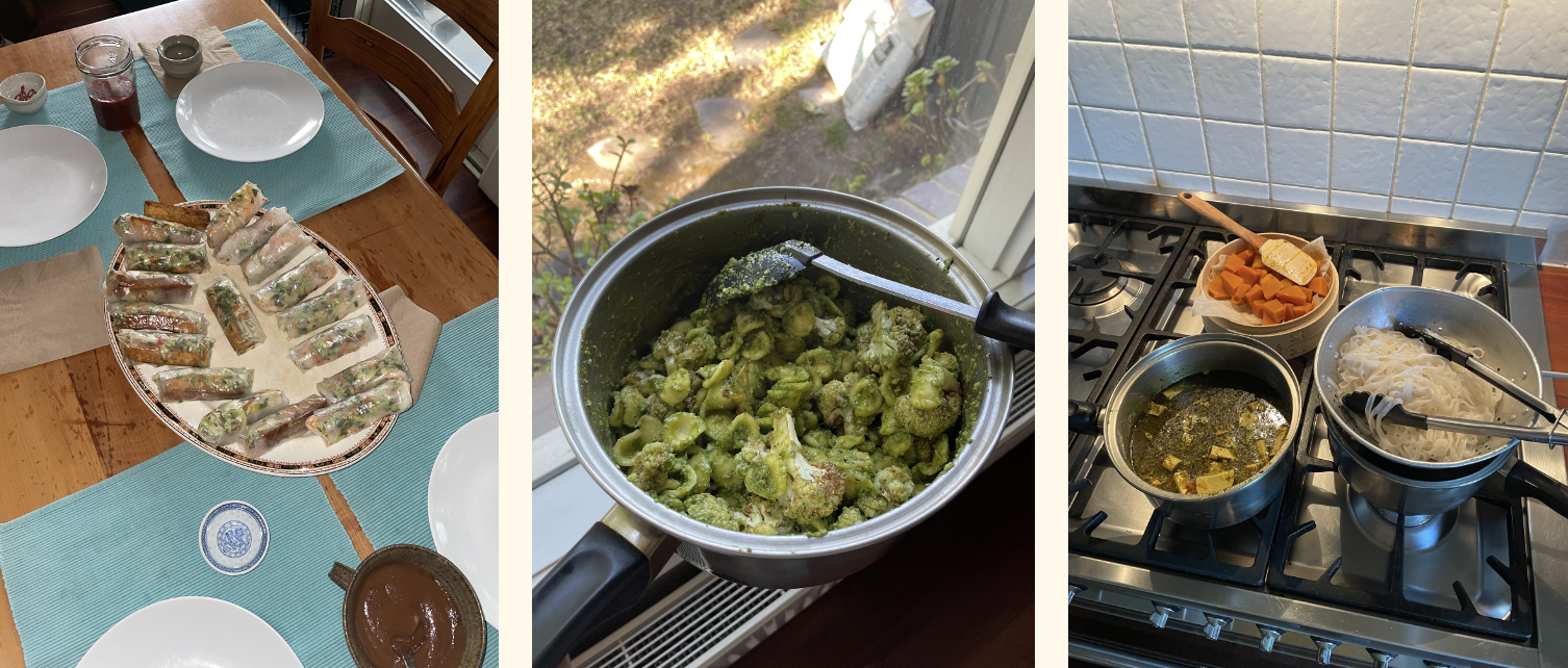 L–R: tofu rice paper rolls with peanut hoisin dipping sauce (I Want Dopamine for Dinner recipe), pesto cauliflower orecchiette pasta and lemongrass, tofu, pumpkin laksa.