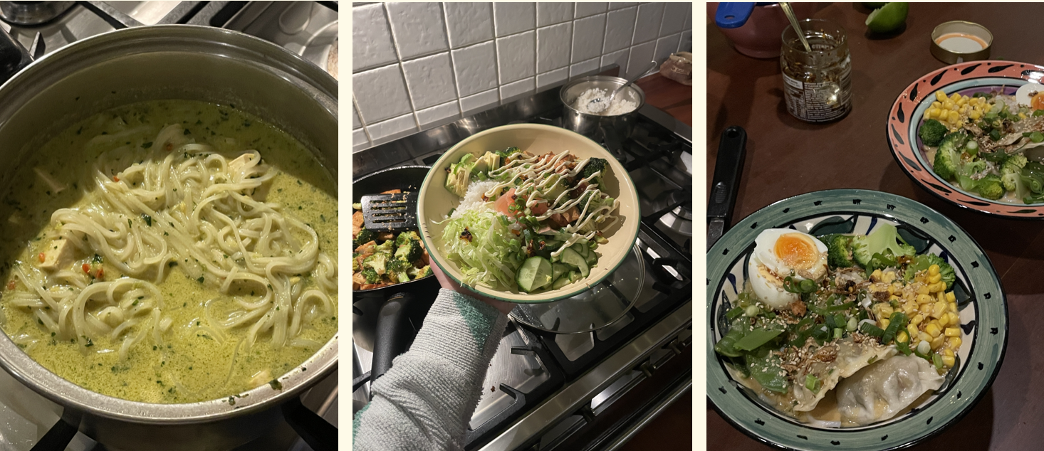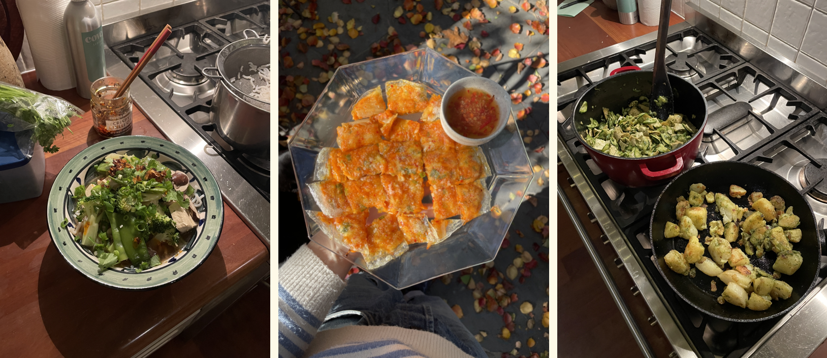 Left-Right: My favourite comfort noodle soup, these carrot kimchi rice paper dumplings and some comforting pesto tofu, zucchini and potatoes.