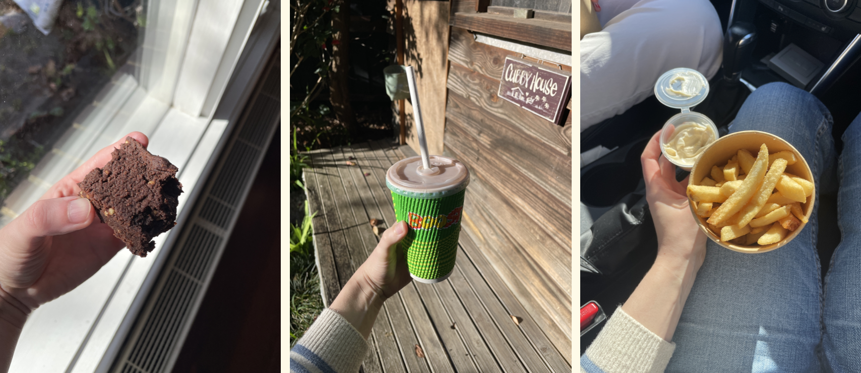Left-Right: Used up a bunch of nut butter odds + ends in the pantry with this brownie recipe by Vegan Richa. Getting a Bananas For Choc Boost after volunteering has become my little ritual. And on Mother's day my brother and I took my grandmother out for hot chippies overlooking the bay, and these ones were 9/10!
