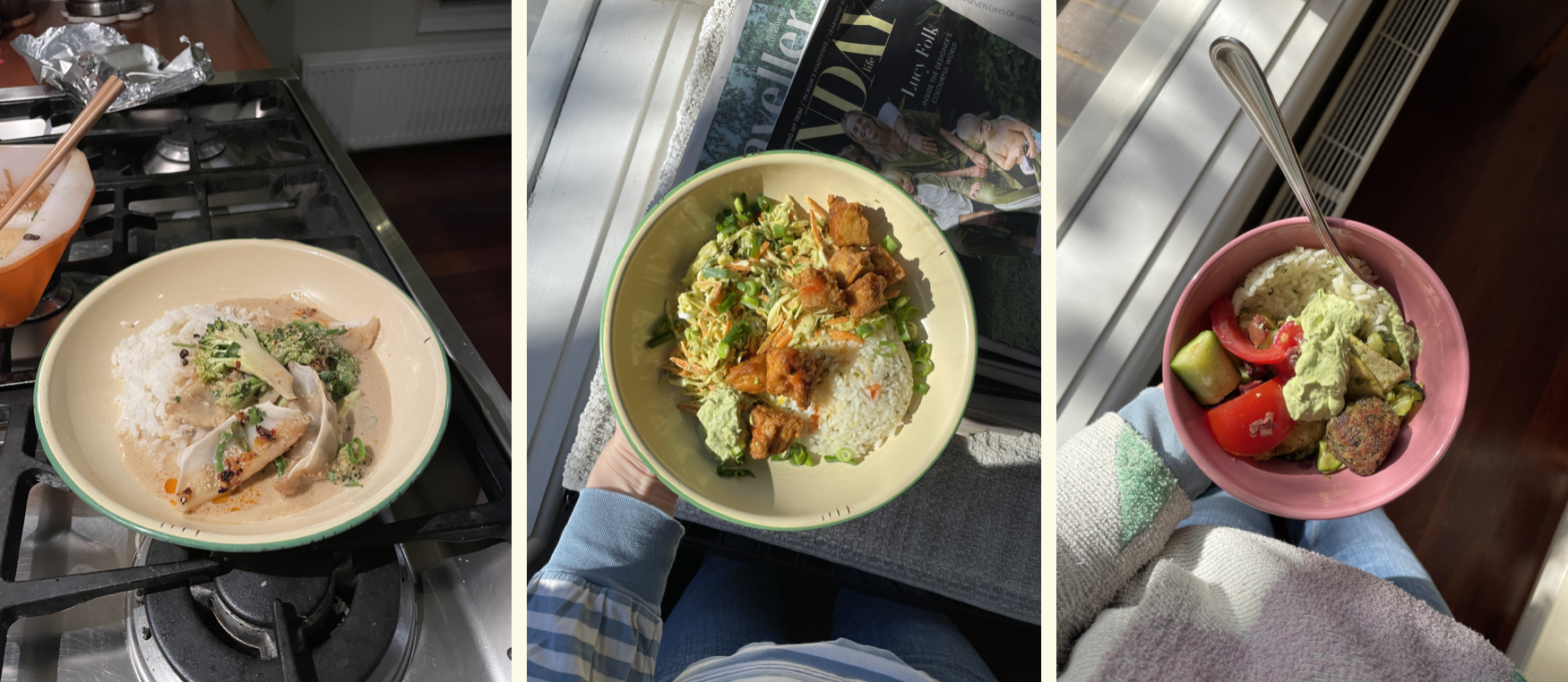 Left-Right: Tried a dump + bake oven dumpling curry, turned my current obsession – buffalo tofu with green goddess slaw (see recipe at the end of this post) – into a rice bowl and had one of many bowls of leftovers in my cheery pink bowl!