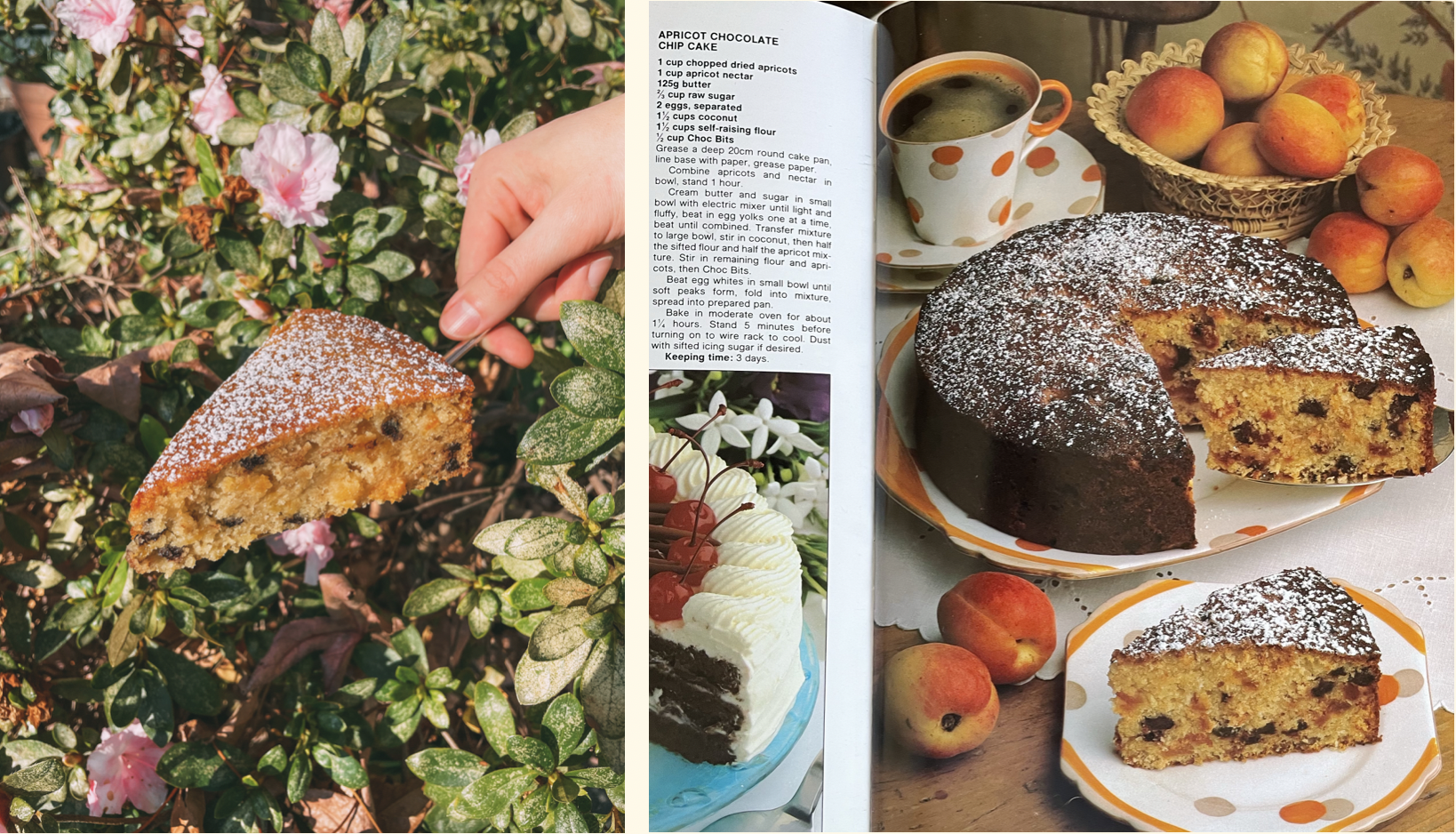 I've made an... Apricot & Chocolate Chip Cake recipe for you all. It's a vegan & gluten-free copycat of a beloved vintage Women's Weekly cookbook recipe many of my mum's friends still swear by as their go-to entertaining cake. The original (see right) is pretty burnt looking so I'm glad my version is a little gentler on the eye. While still not exactly a "looker" the reward's in the eating!