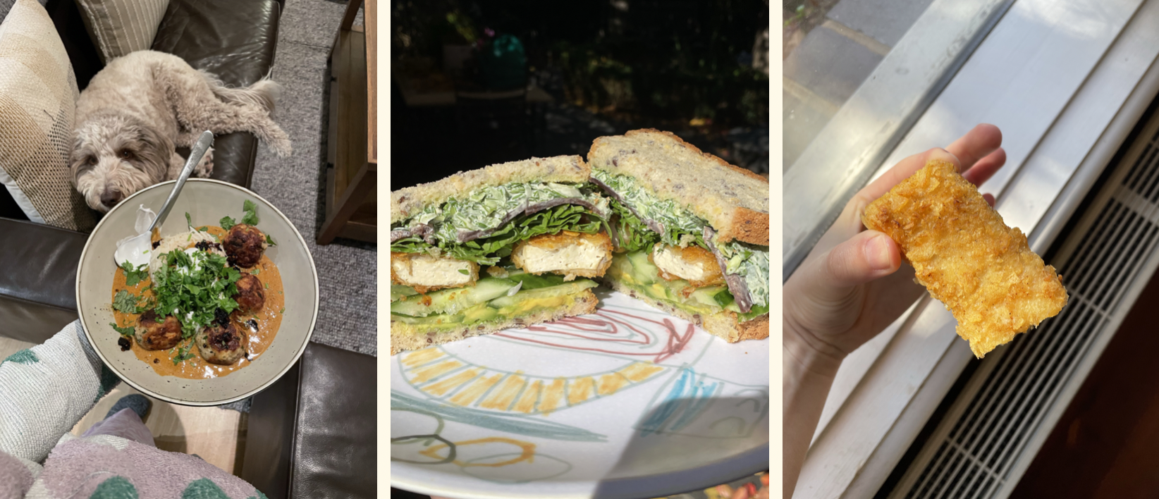 I started the month doing a lovely house sit with Ruby the doodle (pictured center). It was a really peaceful time. While there, I reacquainted myself with the Prince of Egypt soundtrack (so good!) while throwing the ball a zillion times, enjoyed sampling all the owners' chilli crisps and made the most delicious butter tofu "chicken" meatball curry (pictured later on).