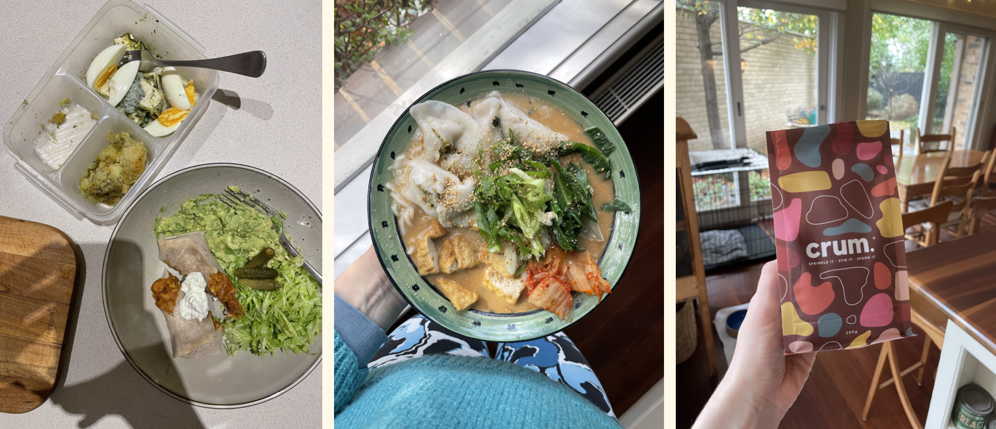 Amy's Kitchen bean burritos with a simple salad, miso ramen bowls with dumplings and Crum by Flora Foods gluten-free milo which is sadly now out of business, but so so delicious.
