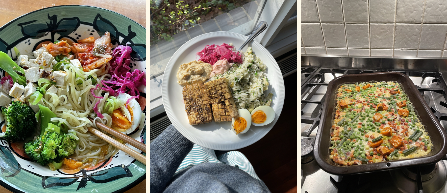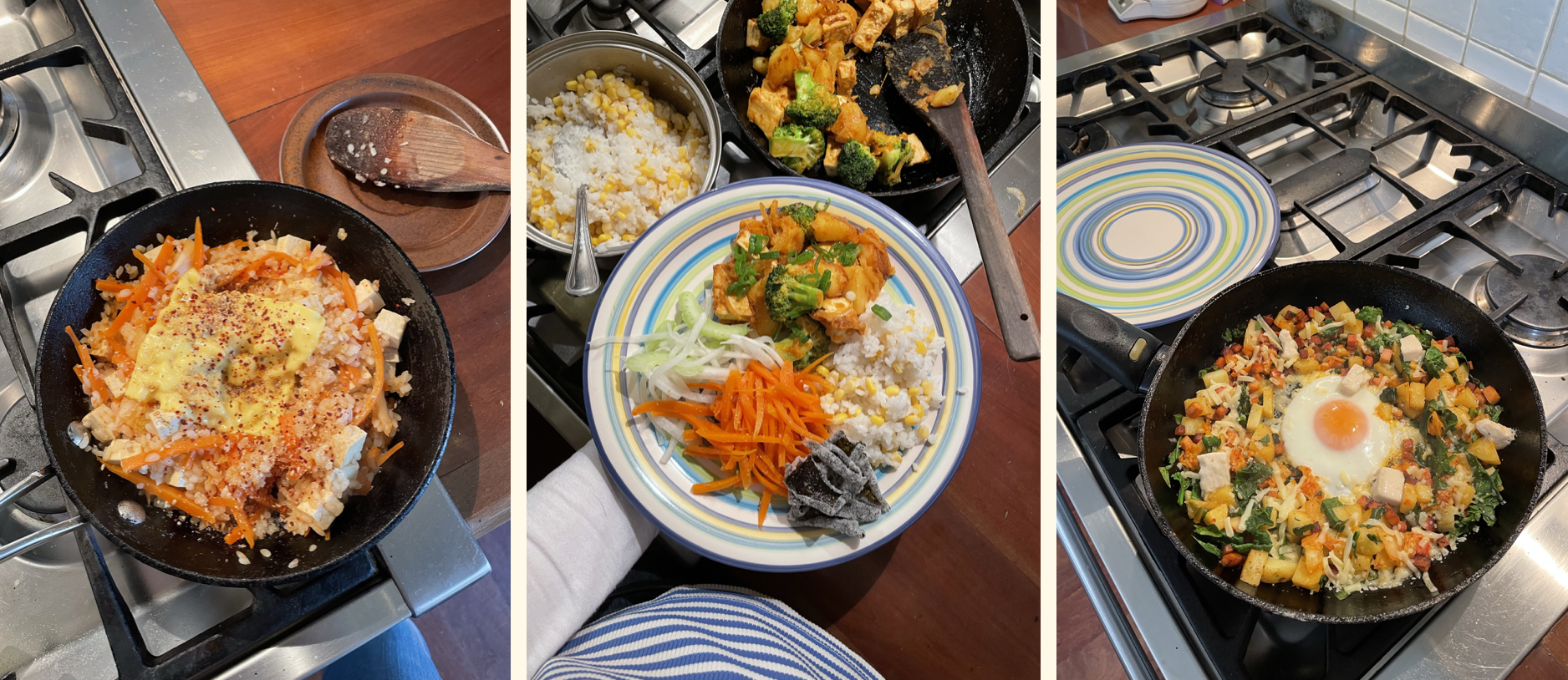 Sesame carrot, tofu & kimchi cheese rice whipped up for lunch, homestyle Japanese dinner spread inspired by Yasuko's Cooking Diaries and a vegan bacon, potato, kimchi, spinach hash with an egg.