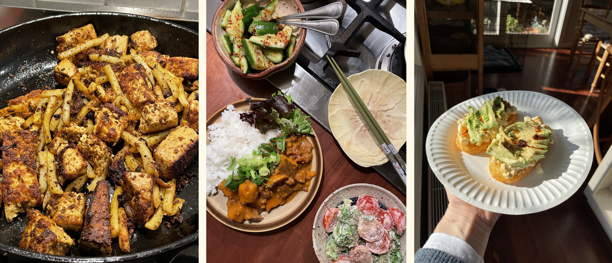 Experimenting with a shawarma seasoning on tofu, another Japanese homestyle spread and an egg-salad, avocado, chilli crisp topped hash brown situation for a Sunday brunch moment.