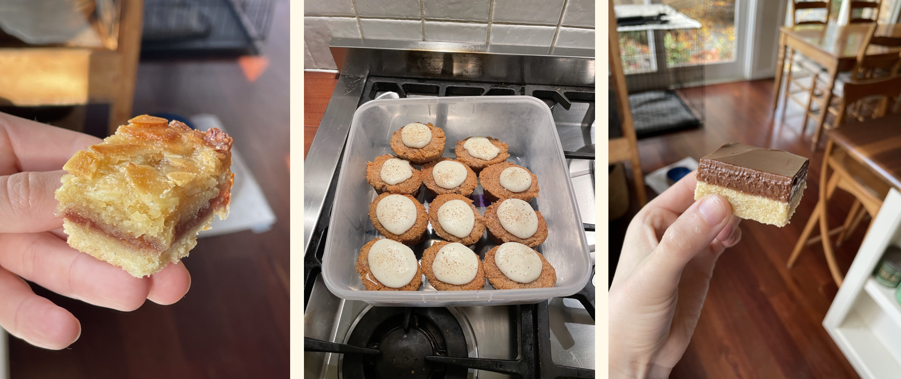 I perfected a frangipane almond slice (froth) and chocolate caramel slice (yum) this month. Custard & nutmeg cakes need one more test, but the flavour combo is the most nostalgic delicious thing omg!
