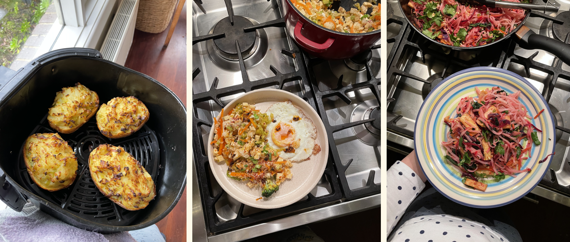 Twice Cooked Potato & Leek Potatoes (a seasonal must!), more Kimchi Carrot Tofu Hash bulked out with an egg and Ginger Tofu Beetroot Pad Thai Noodles from my low fodmap cookbook Big Mouth.