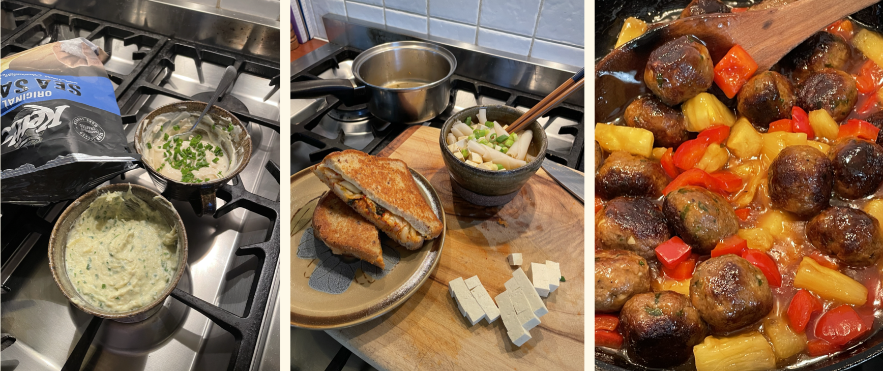 Playing around with 90s dips – Artichoke and French Onion Dip (made from mixing vegan sour cream with french onion soup mix!). Kimchi Toasties (forever & always) with Instant Asian-Style Soups I bulk up with tofu and greens. Then some Hawaiian Sweet & Sour Meatballs which were fun but not my favourite.