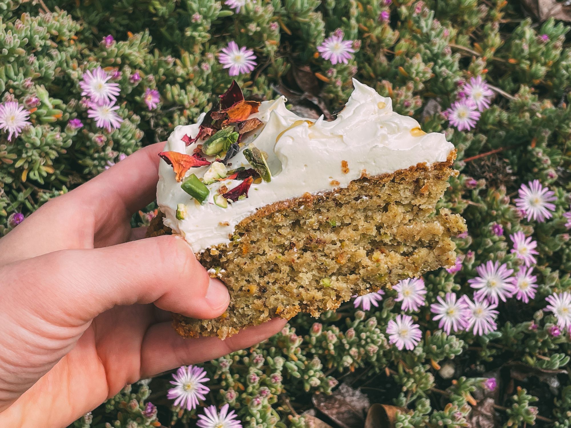 - Ice the cooled cake & decorate with rose petals, chopped pistachios and brown rice syrup (or honey), if desired. Best kept at room temperature, as the icing will harden in the fridge. Still delicious (you can always bring it back to room temp if desired), just something to keep in mind when serving.